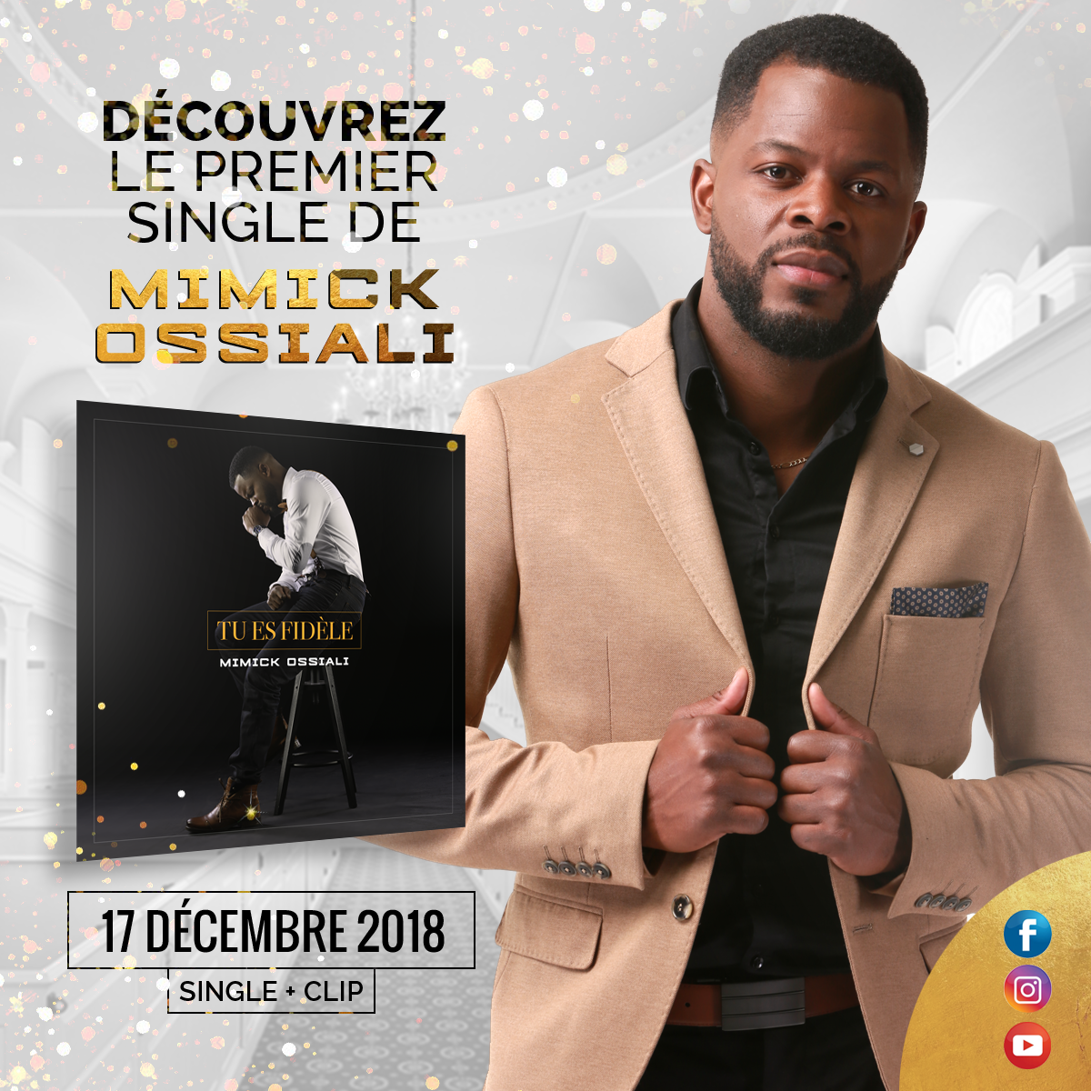 Le 17 décembre 2018, la scène gospel comptera un nouvel artiste: Mimick Ossiali. « Tu es fidèle » est le titre de son premier projet. Laissez-moi vous dire combien j’aime la plume de Mimick. C’est un artiste auquel je crois et c’est pour cette raison que je vous le présente aujourd'hui. Il se distingue depuis 3 ans sur les scènes parisiennes, et concrétise enfin un projet discographique très attendu.