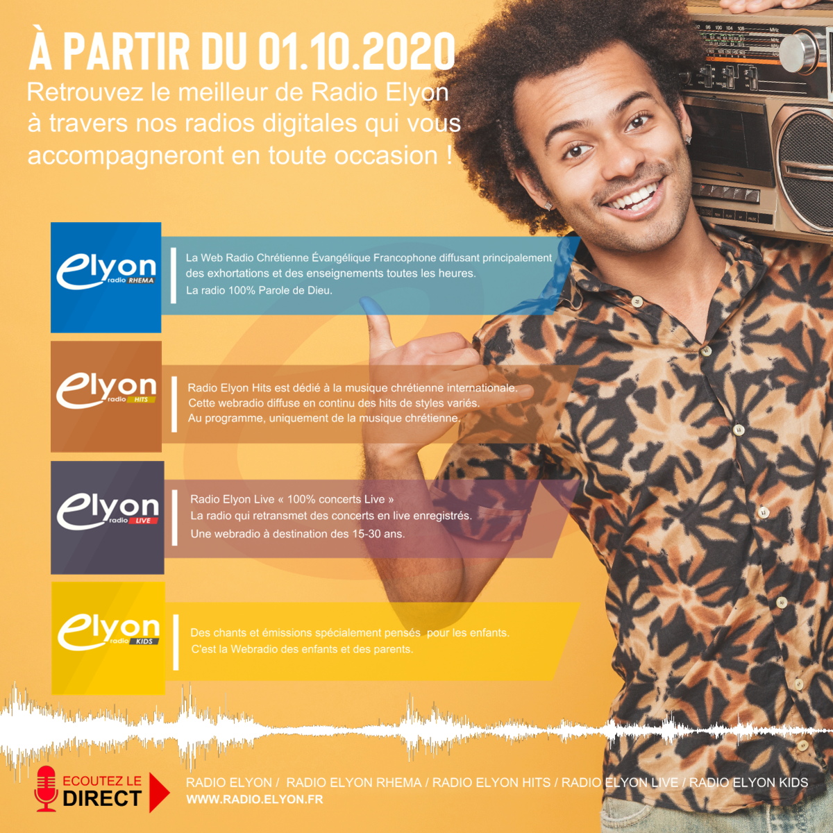 À partir du 1er octobre 2020, retrouvez le meilleur de Radio Elyon à travers nos webradios digitales qui vous accompagneront en toute occasion ! #RadioElyonRhema #RadioElyonHits #RadioElyonLive #RadioElyonKids