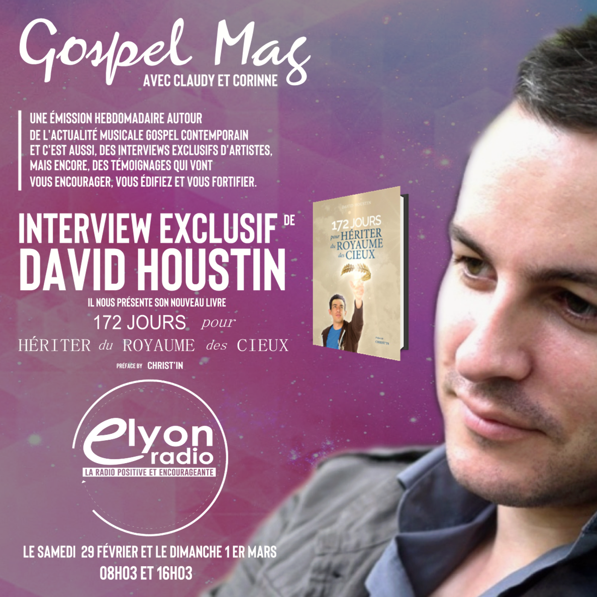 Découvrez l'interview exclusif de David Houstin dans l'émission du Gospel Magazine le samedi 29 février et dimanche 1er mars 2020 sur Radio Elyon.
