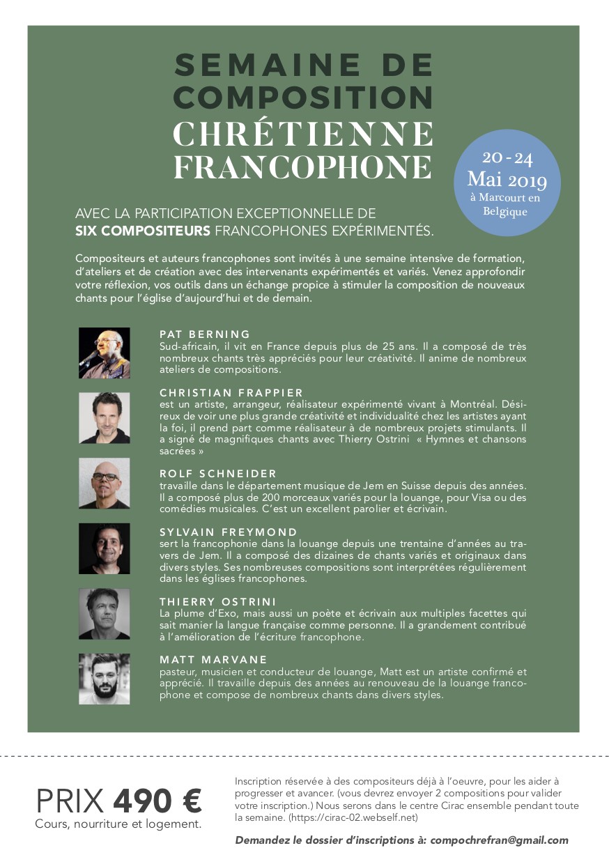 Participer à la semaine de composition chrétienne Francophone les 20, 21, 22, 23 et 24 mai 2019 à Marcourt en Belgique.
